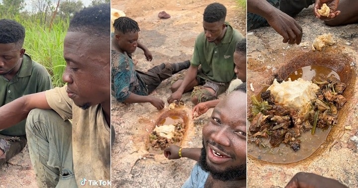 “Is this ritual?” – Young men dig hole on bare ground to eat fufu and soup (Video)