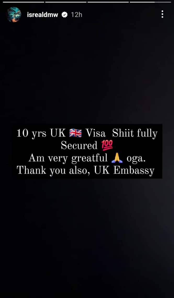 Media personality, Israel DMW is overwhelmed with joy and gratitude to his boss, Davido as he secures a 10-year UK visa.
