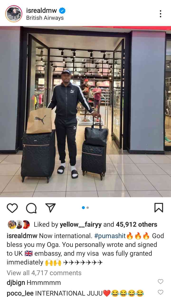Israel who had arrived London didn’t waste time to write a message of thanks to his boss Davido who had played a crucial role in getting his Visa.