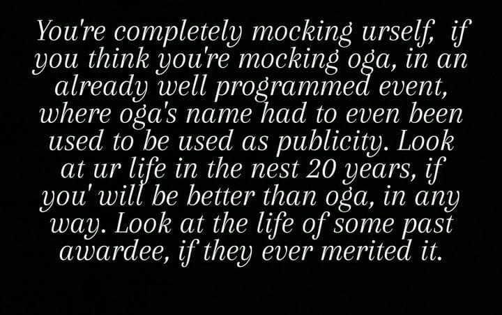 His words: “You’re completely mocking urself, if you think you’re mocking oga, in an already well programmed event, where oga’s name had to even been used to be used as publicity. Look at ur life in the nest 20 years, if you’ will be better than oga, in any way. Look at the life of some past awardee, if they ever merited it.”