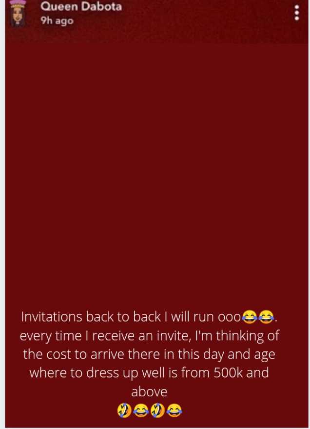 Dabota who is always spotted in a lovely dressing during any events she is bound to attend has cried out on social media over High cost when attending one of those events.
