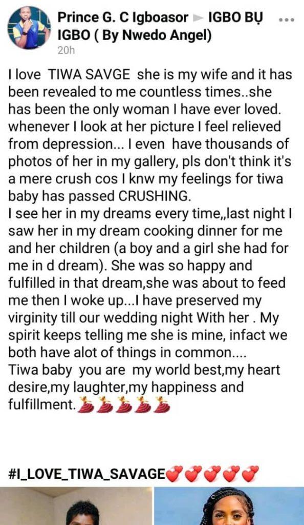 According to a Facebook user identified as Prince G. C Igboasor who is reserving his virginity for the mother of one stated in a post that Tiwa Savage is the only women he has loved.