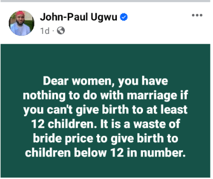 A Nigerian man John-Paul Ugwu has taken to social media to share his unconventional views on marriage, asserting that women who cannot give birth to at least 12 children should not get married.