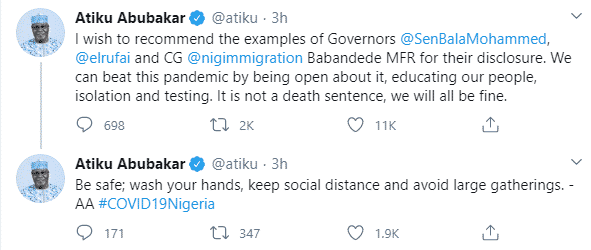 Tweeting this morning, Atiku, whose son was diagnosed last week of coronavirus, said;