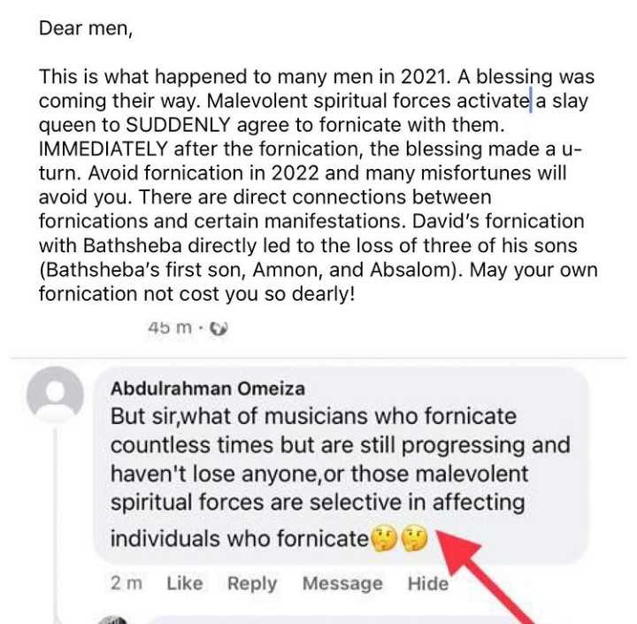 In line with this, Abdulrahman Omeiza (his follower) asked, “But sir, what of musicians who fornicate countless times but are still progressing and haven’t lose anyone, or those malevolent spiritual forces are selective in affecting individuals who fornicate.”