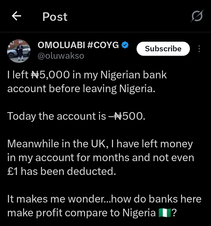 ”I left ₦5,000 in my Nigerian bank account before leaving Nigeria. Today the account is ₦500.Meanwhile in the UK, I have left money in my account for months and not even £1 has been deducted.It makes me wonder how do banks here make profit compare to Nigeria 🇳🇬?”, The tweet reads.