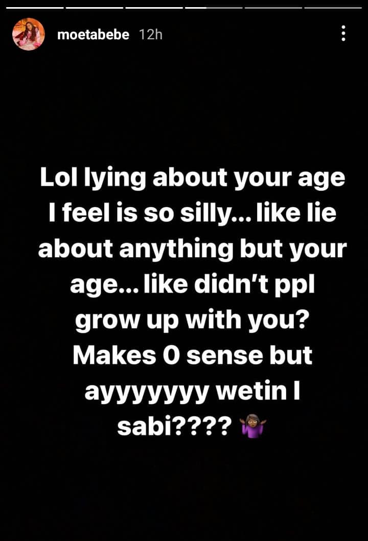 “Lol lying about your age I feel is so silly… like lie about anything but your age… like didn’t ppl grow up with you? Makes O sense but AYYYY wetin I sabi???”