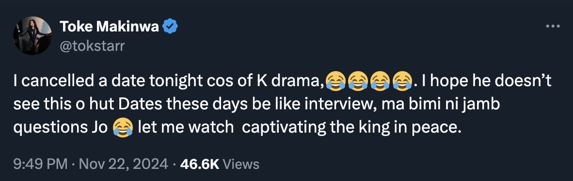 “I cancelled a date tonight cos of K drama, 😂😂😂😂. I hope he doesn’t see this o but dates these days be like interview, ma bimi ni jamb questions Jo 😂 let me watch ‘Captivating the King’ in peace.”