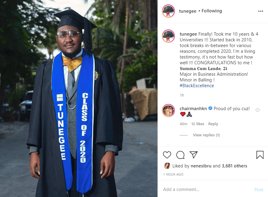 Sharing photos with his graduation gown on Instagram, Tunji revealed that the degree took him 10 years and 4 universities. Read as he posted below…