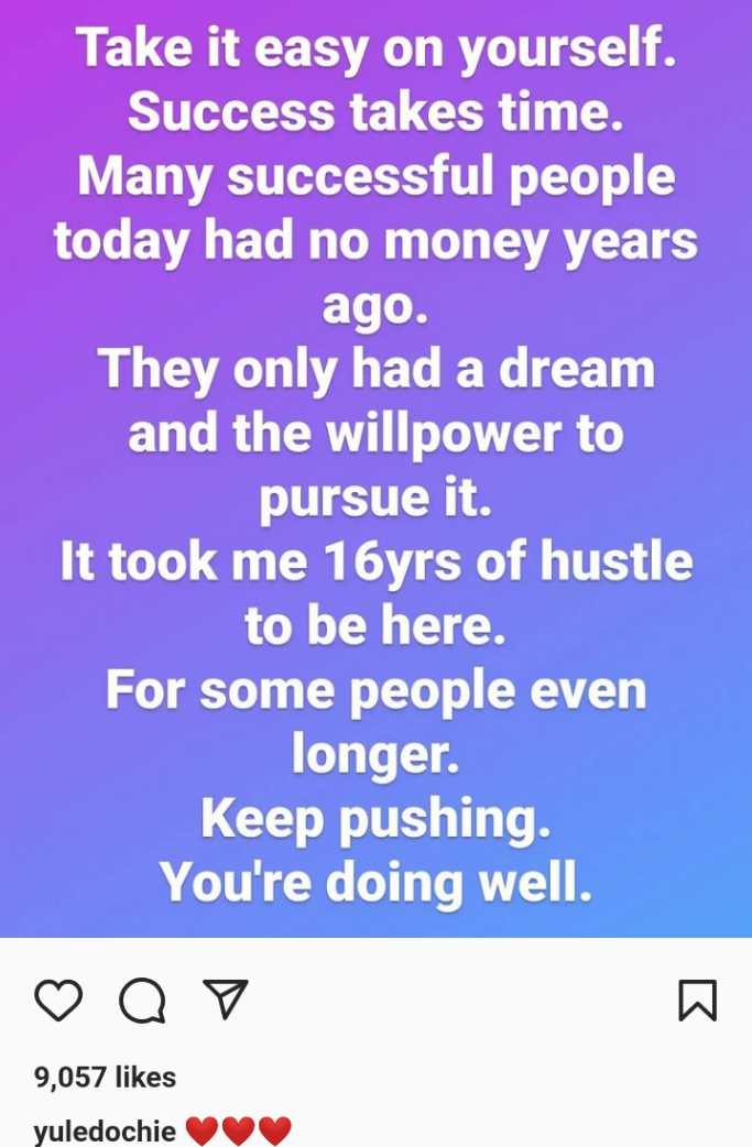 Taking to his Instagram page, Yul gave his advice, using himself as a referencing point, revealing how 16 years went by before he could attain his present status in society.