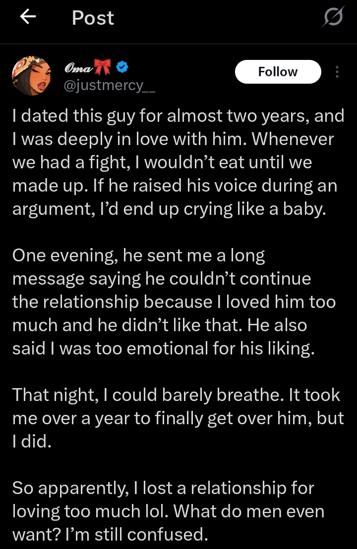 A lady’s post revealing why her ex-boyfriend ended their relationship has gone viral, sparking reactions online.