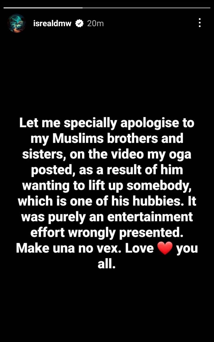 “Let me specially apologise to my Muslims brothers and sisters, on the video my oga posted, as a result of him wanting to lift up somebody, which is one of his hubbies. It was purely an entertainment effort wrongly presented. Make una no vex. Love you all.”