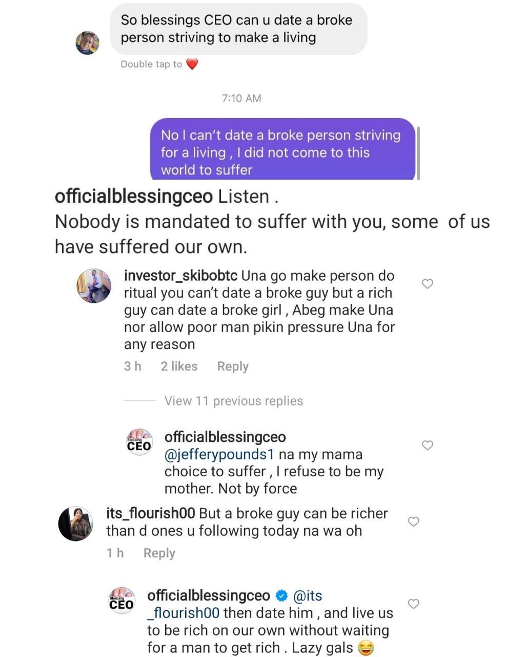 She added: “No, I can’t date a broke person striving for a living. I did not come to this world to suffer.”