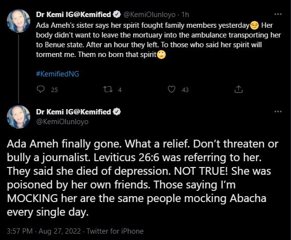 “Ada Ameh’s sister says her spirit fought family members yesterday😏 Her body didn’t want to leave the mortuary into the ambulance transporting her to Benue state. After an hour they left. To those who said her spirit will torment me. Them no born that spirit🙄.”