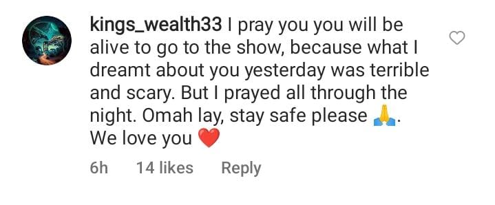 A fan, @kings_wealth33, left a comment on Omah Lay’s Instagram post, sharing that he had a terrible and scary dream about him.