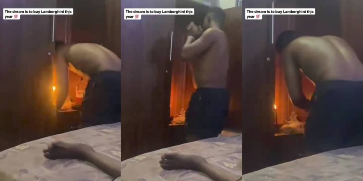 A man was captured in a video allegedly engaging in money rituals from the wardrobe in his house with a lit up candle and alcoholic drink.