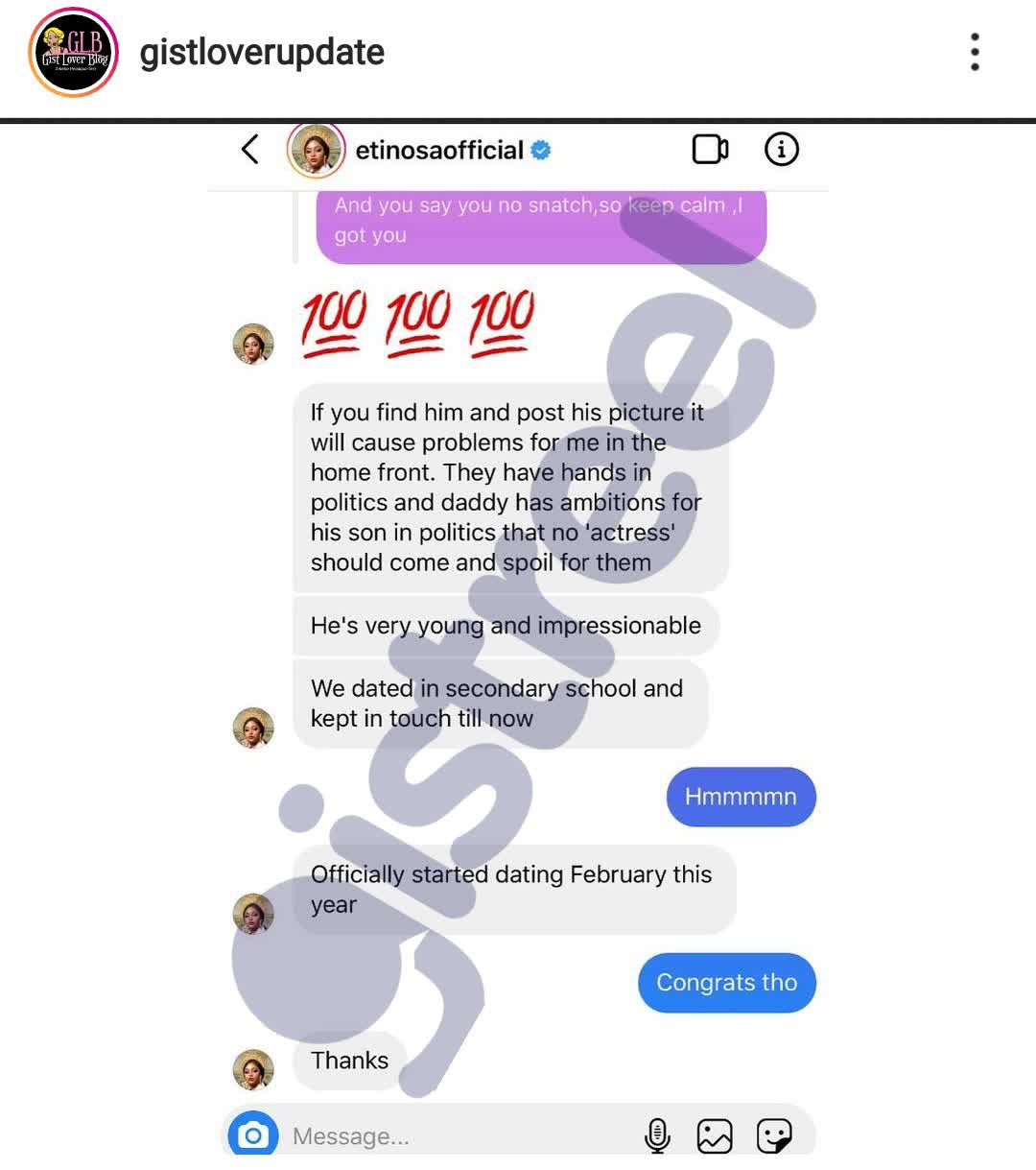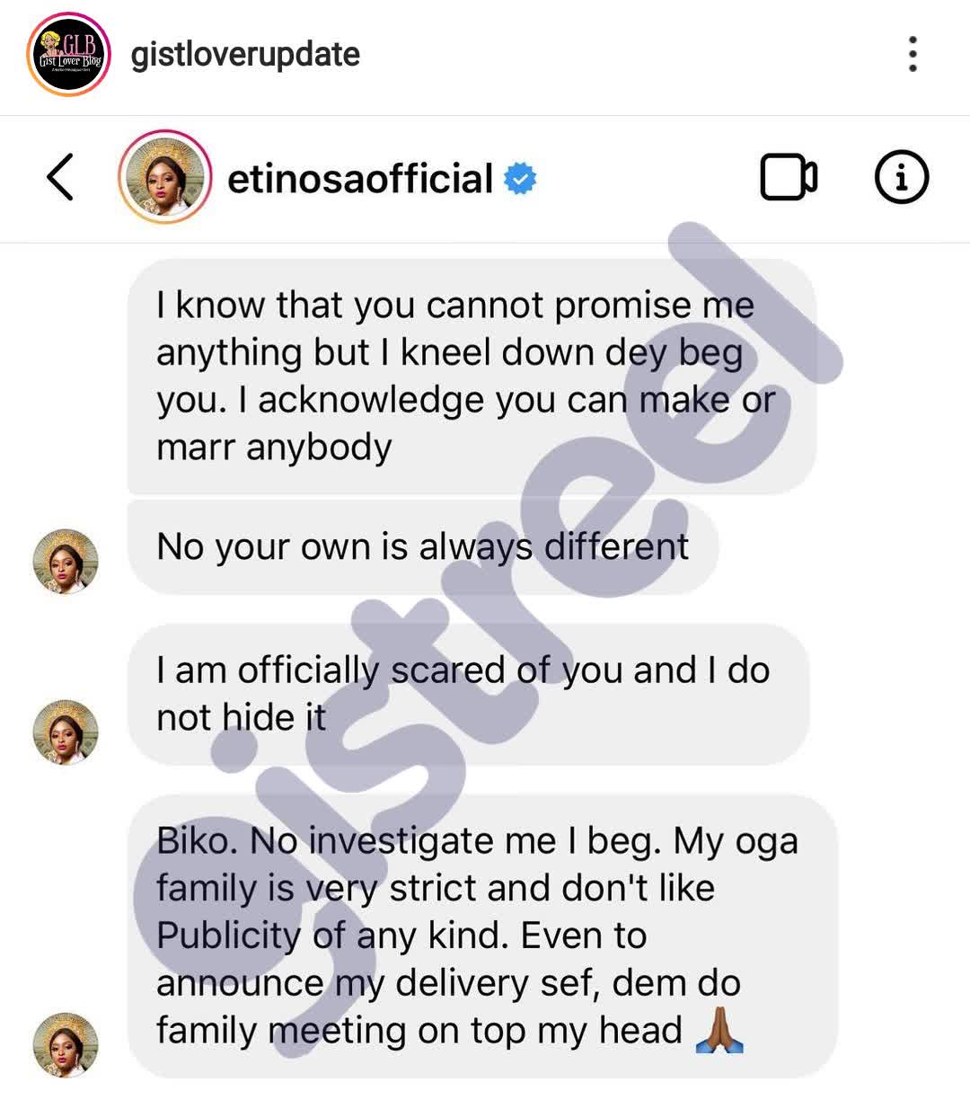 The conversation which was shared by popular blogger, Gistlovers, shows Etinosa allegedly begging the blogger not to reveal the face of her lover, while explaining that his family is very strict.