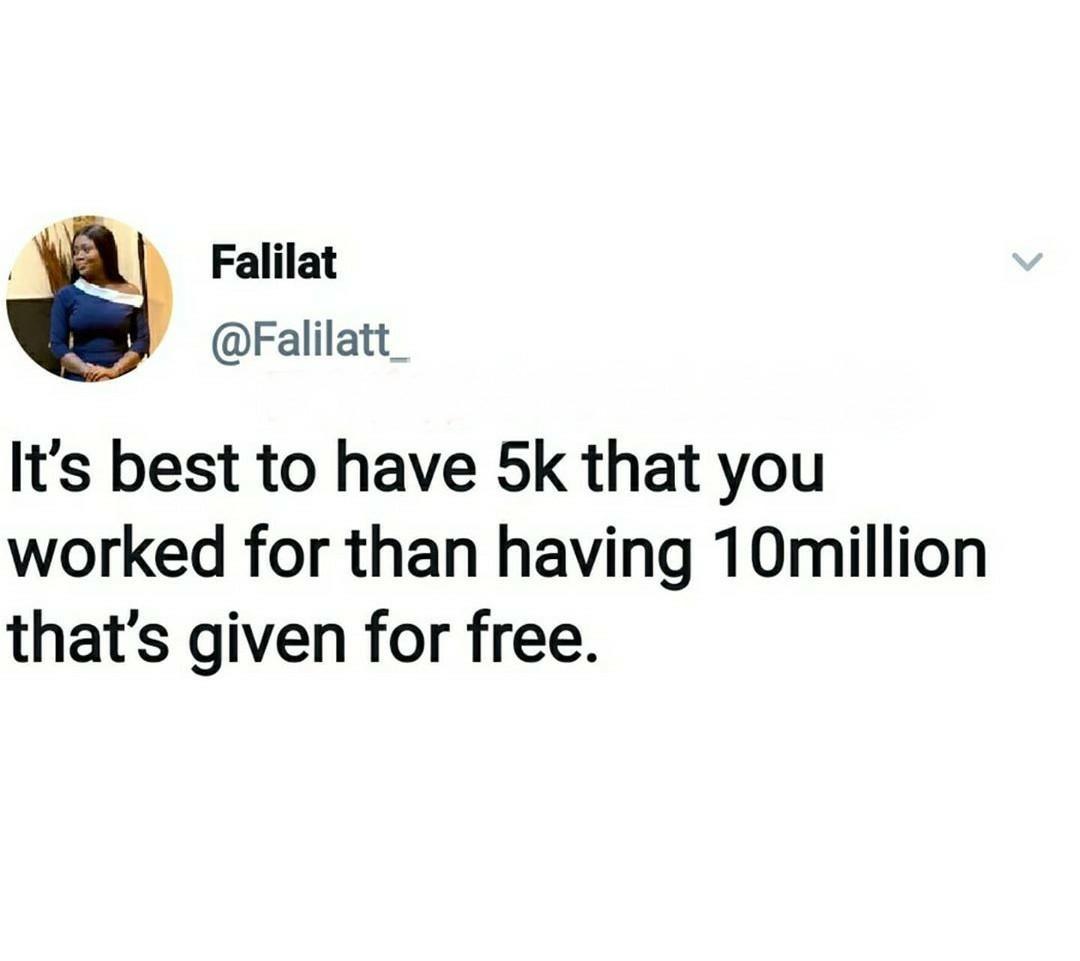 “It’s best to have N5k that you worked for than having N10million for free”, she wrote.