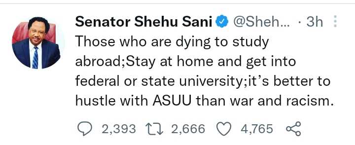 “It’s better to hustle with ASUU than war and racism; stay at home and get into Fed and State Universities” – Shehu Sani tells those dying to go study overseas