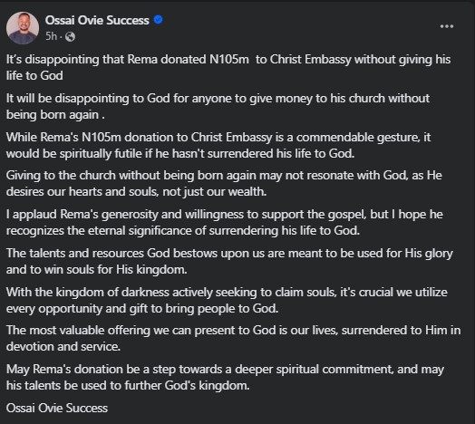 Delta State Governor’s aide, Ossai Ovie Success, has reacted following Afrobeat singer, Rema‘s kind donation of N105 million to Christ Embassy.