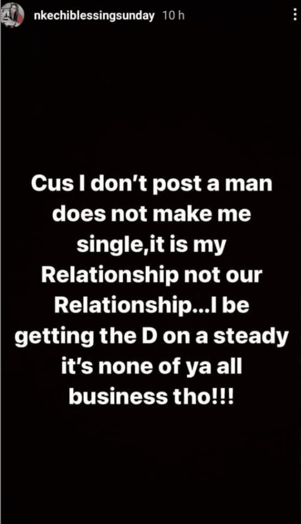“Cus I don’t post a man does not make me single, it is my Relationship not our Relationship… I be getting the D on a steady it’s none of ya all business tho!!!,” she wrote.