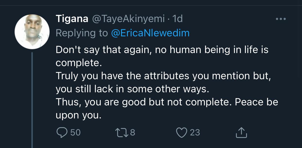 “Don’t say that again, no human being in life is complete. Truly you have the attributes you mention but, you still lack in some other ways. Thus, you are good but not complete. Peace be upon you.”