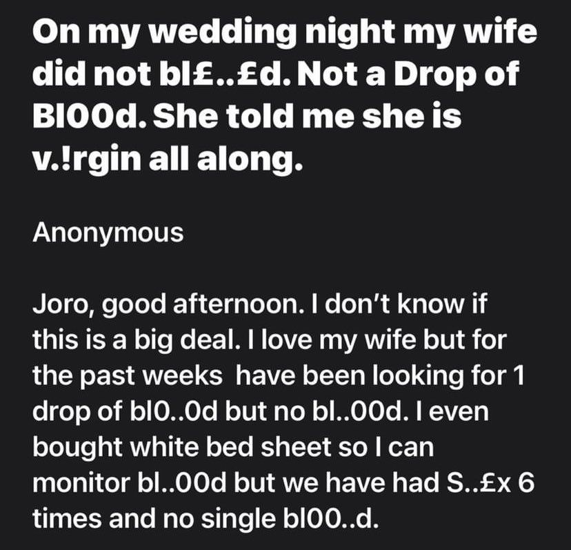 Joro, good afternoon. I don’t know if this is a big deal. I love my wife but for the past weeks have been looking for 1 drop of blO..Od but no bl..00d. I even bought a white bed sheet so I can monitor bl..00d but we have had S..Ex 6 times and no single bl00..d.