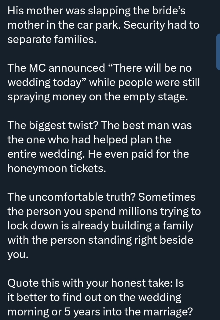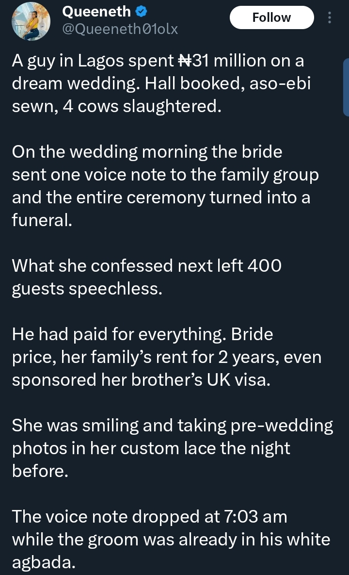A dramatic wedding-day revelation has stirred intense reactions on social media after a Lagos-based lady shared a shocking story on X (formerly Twitter).