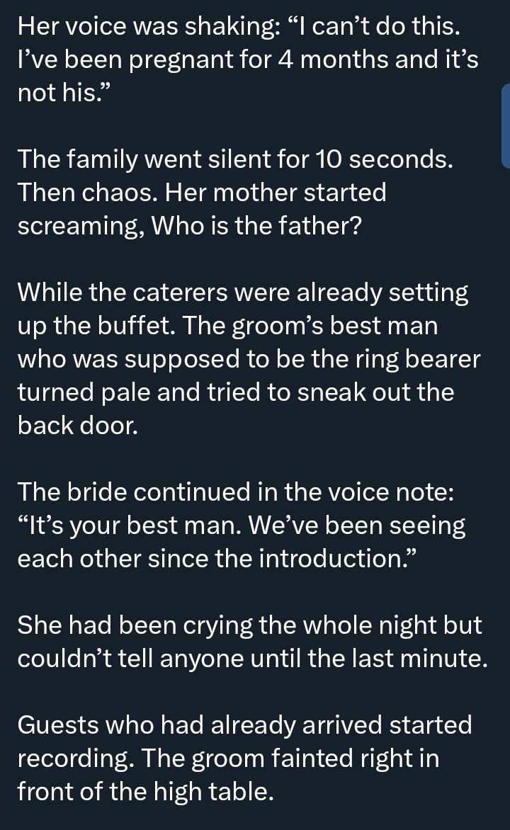 According to her account, what was meant to be a lavish and joyful wedding ceremony reportedly turned into chaos after a last-minute confession by the bride.