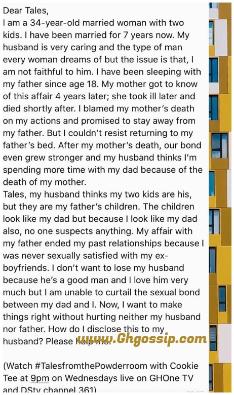 A Ghanaian woman has made a shocking revelation on GHOne’s adult-rated programme dubbed Tales from the Powder room by revealing that she has been having sekz with her own biological father.