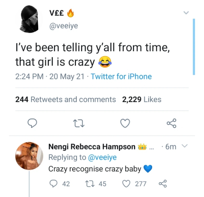 Reacting to this, Nengi Hampson tweeted that it’s only a crazy person that can recognize a fellow crazy person.