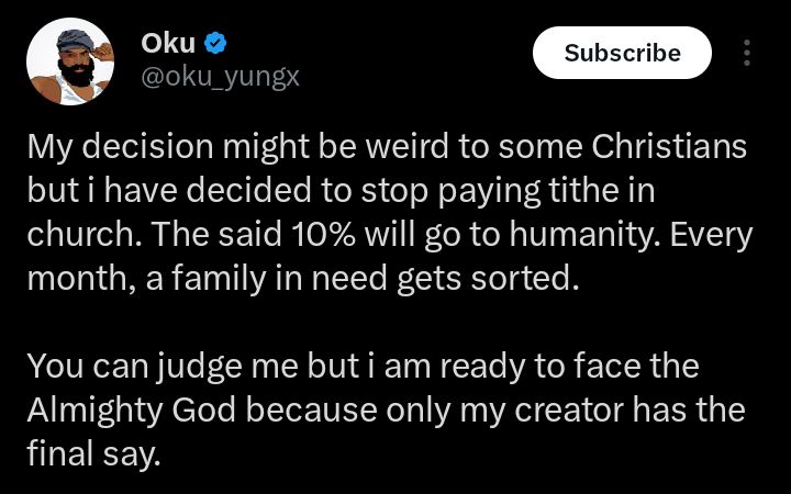 A man has stirred debate online after announcing his decision to stop paying tithes in church, choosing instead to redirect the money toward helping families in need.