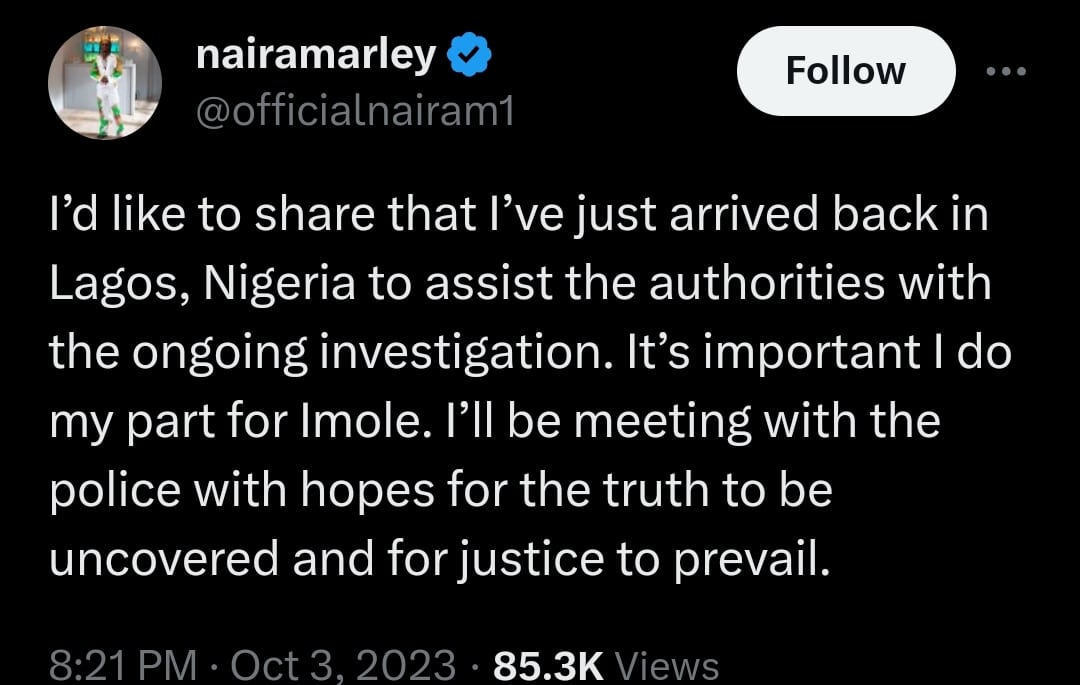 In his statement, he said, “I’d like to share that I’ve just arrived back in Lagos, Nigeria to assist the authorities with the ongoing investigation. It’s important I do my part for Imole. I’ll be meeting with the police with hopes for the truth to be uncovered and for justice to prevail.”