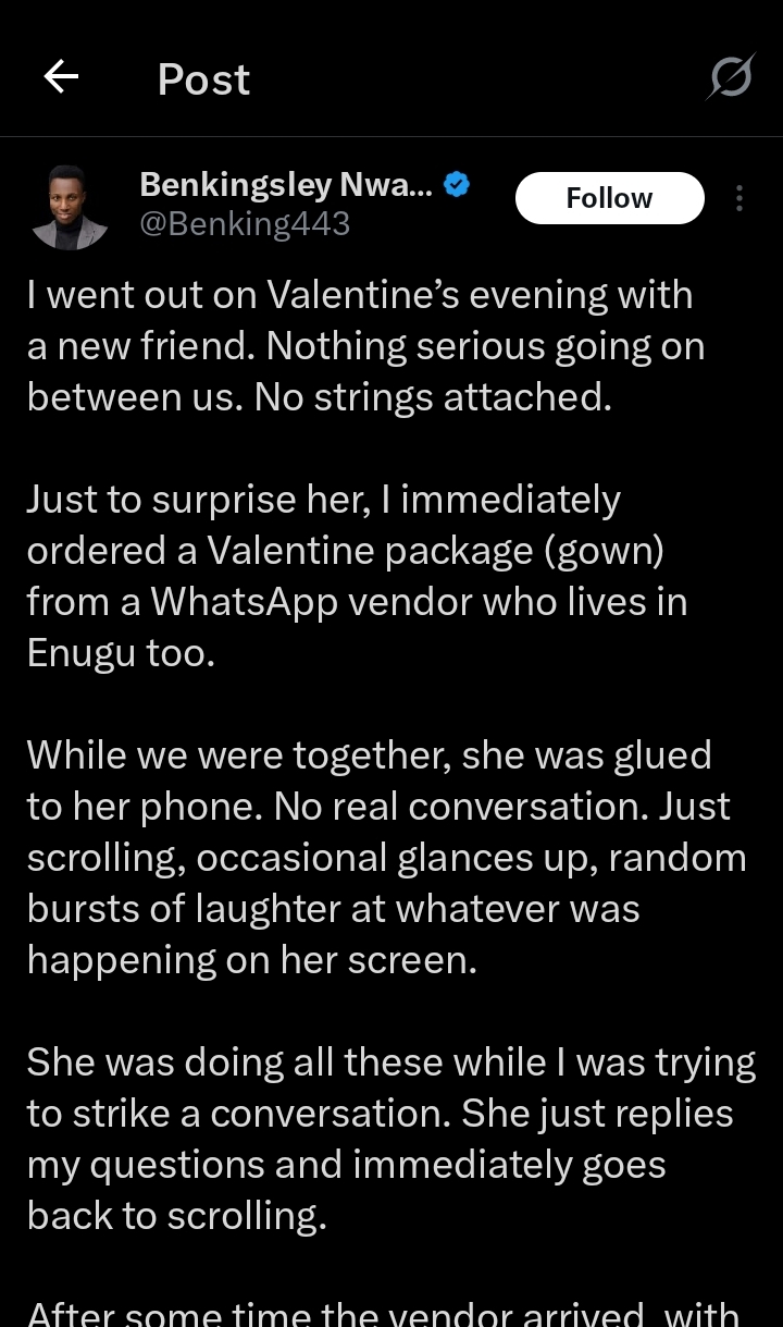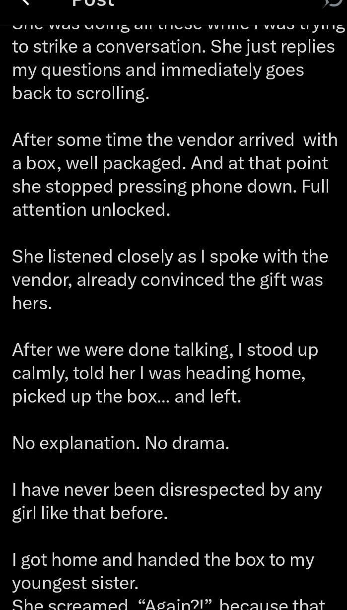 ”After some time the vendor arrived with a box, well packaged. And at that point she stopped pressing phone down. Full attention unlocked.She listened closely as I spoke with the vendor, already convinced the gift was hers. After we were done talking, I stood up calmly, told her I was heading home, picked up the box and left”, His tweet reads in part.
