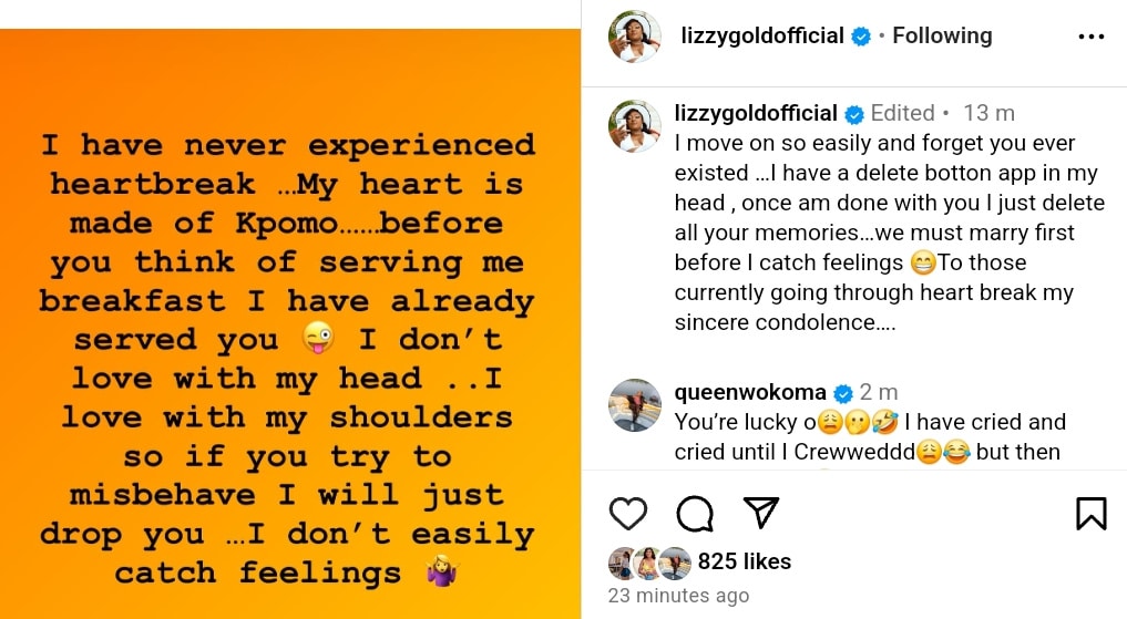 According to Lizzy Gold, she has trained her heart to a point where she doesn’t easily catch feelings when she is in a relationship with a man.
