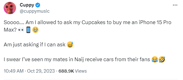 “Soooo…. Am I allowed to ask my Cupcakes to buy me an iPhone 15 Pro Max? Am just asking if I can ask. I swear I’ve seen my mates in Naij receive cars from their fans.”