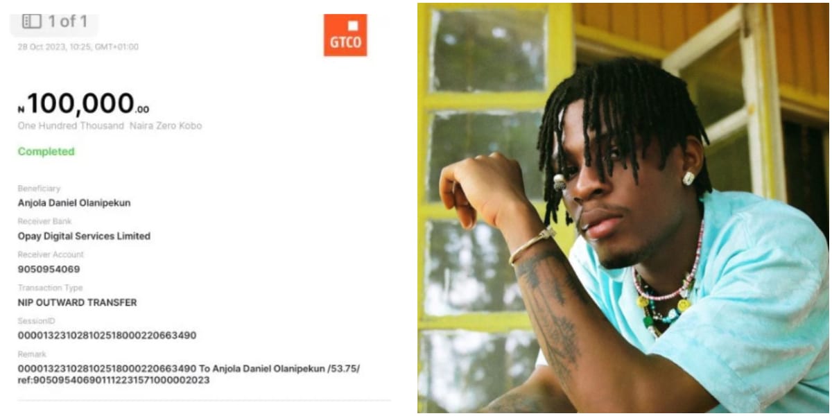 One of the fortunate recipients of Joeboy’s generous offer, Anjola Olanipekun, expressed his gratitude by sharing a screenshot of the N100,000 transaction on social media.