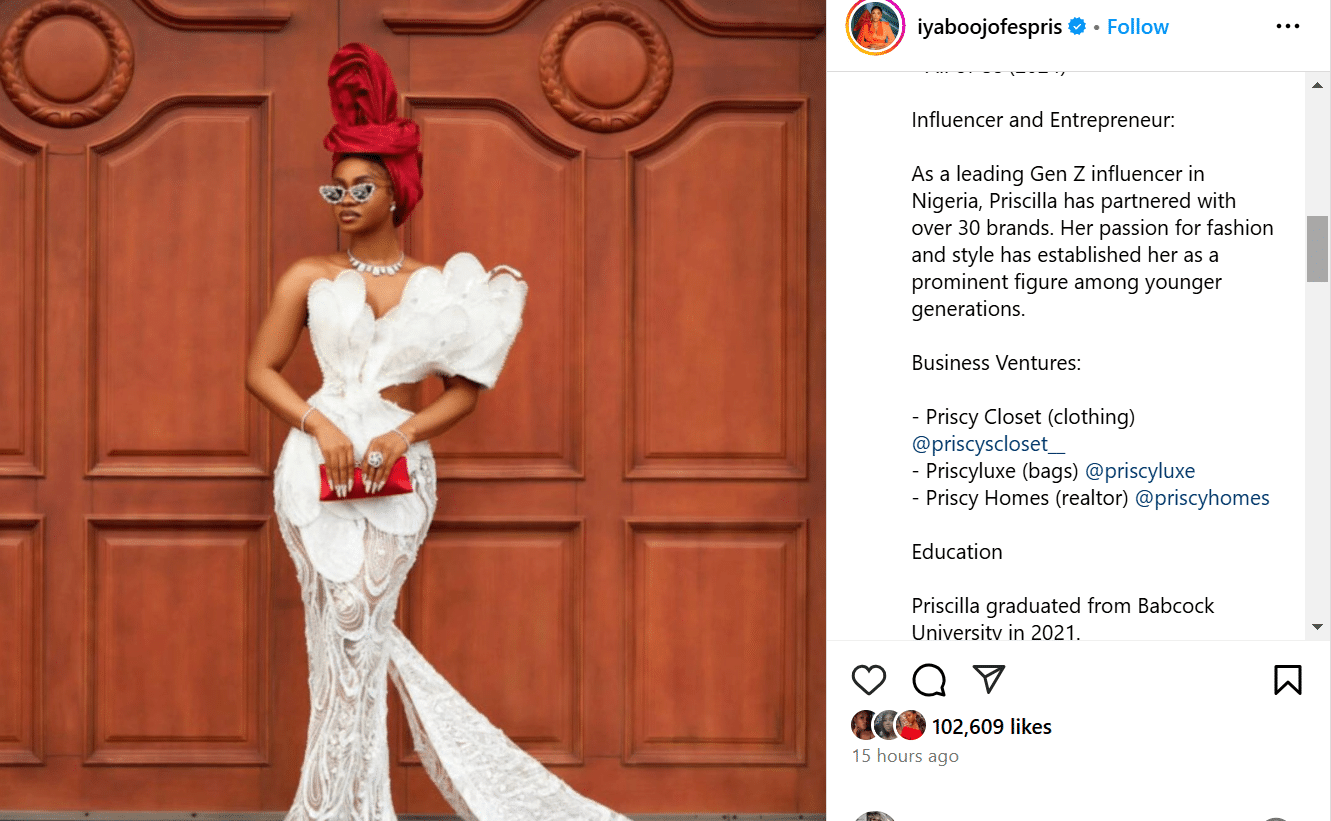 Priscilla Ajoke Ojo is a Nigerian actress, model, social media influencer, and entrepreneur born on March 13, 2001, in Lagos State, Nigeria.