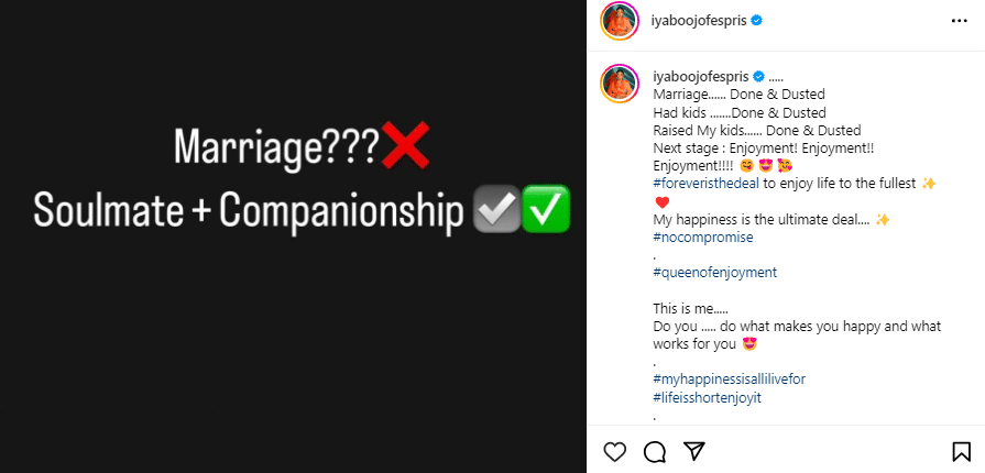 Notable thespian, Iyabo Ojo speaks on canceling marriage from her plans as she notes that she’s focusing on enjoying her life.