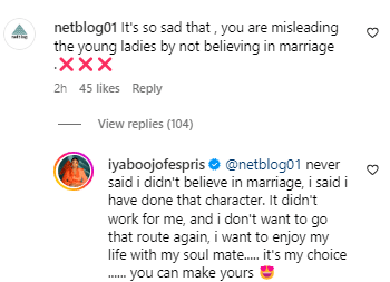 “@netblog01 never said i didn’t believe in marriage, i said i have done that character. It didn’t work for me, and i don’t want to go that route again, i want to enjoy my life with my soul mate….. it’s my choice …… you can make yours 😍”