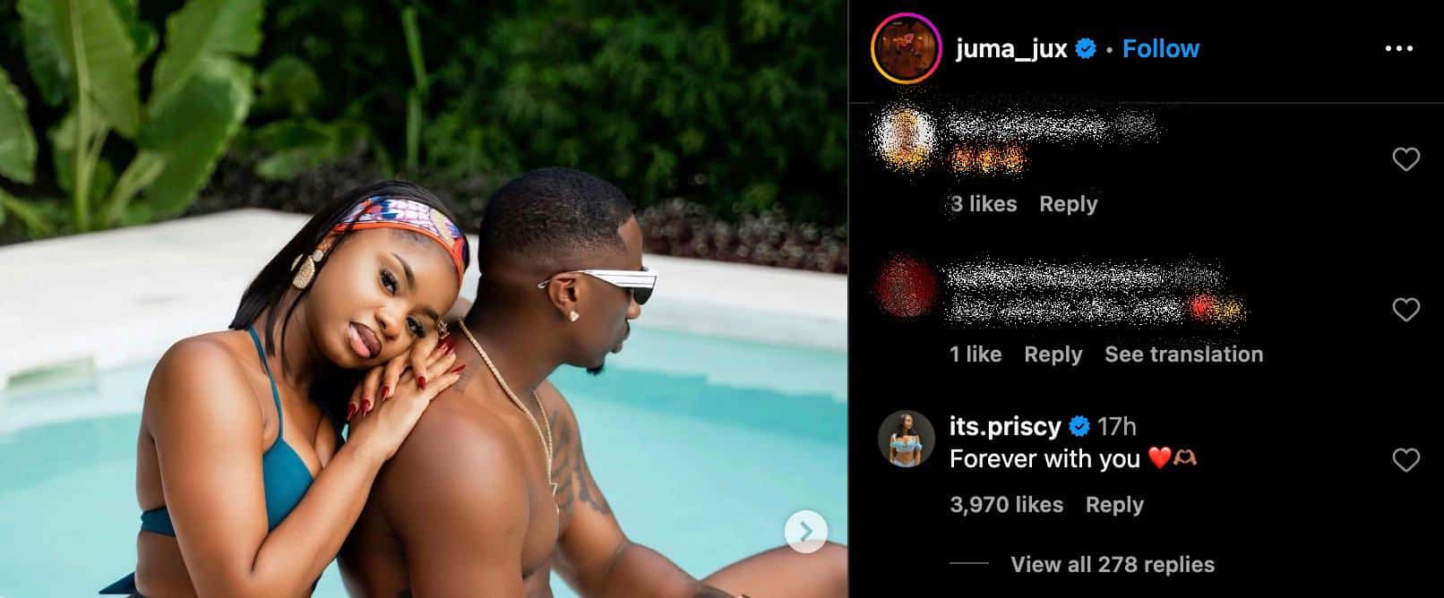 This came a few days ago after Priscilla sparked internet buzz with a video featuring her and Jux. The pair were seen at a club, and in the viral videos, Priscilla was captured twerking on the singer.