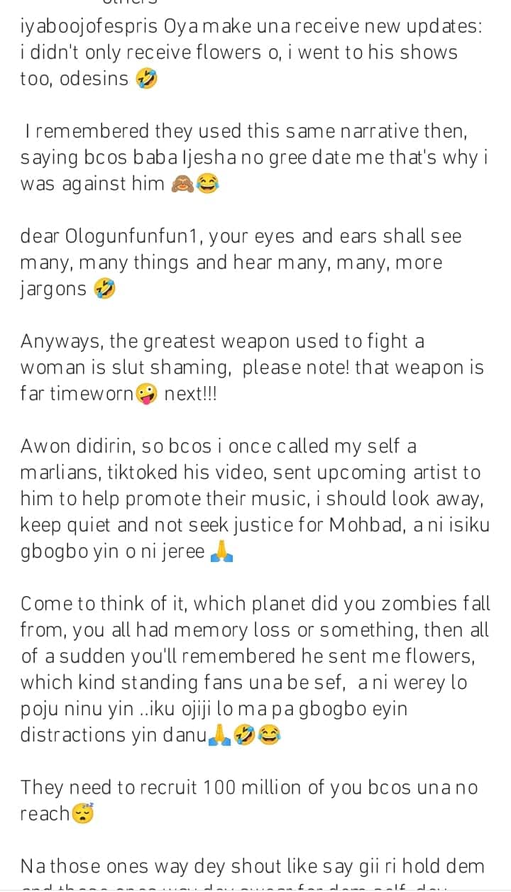 Awon didirin, so bcos i once called my self a marlians, tiktoked his video, sent upcoming artist to him to help promote their music, i should look away, keep quiet and not seek justice for Mohbad, a ni isiku gbogbo yin o ni jeree 🙏