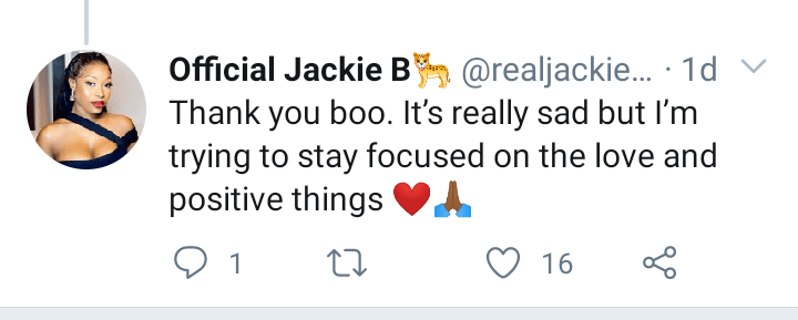 Replying to a fan who expressed sympathy, she wrote, “Thank you boo. It’s really sad but I’m trying to stay focused on the love and positive things.”