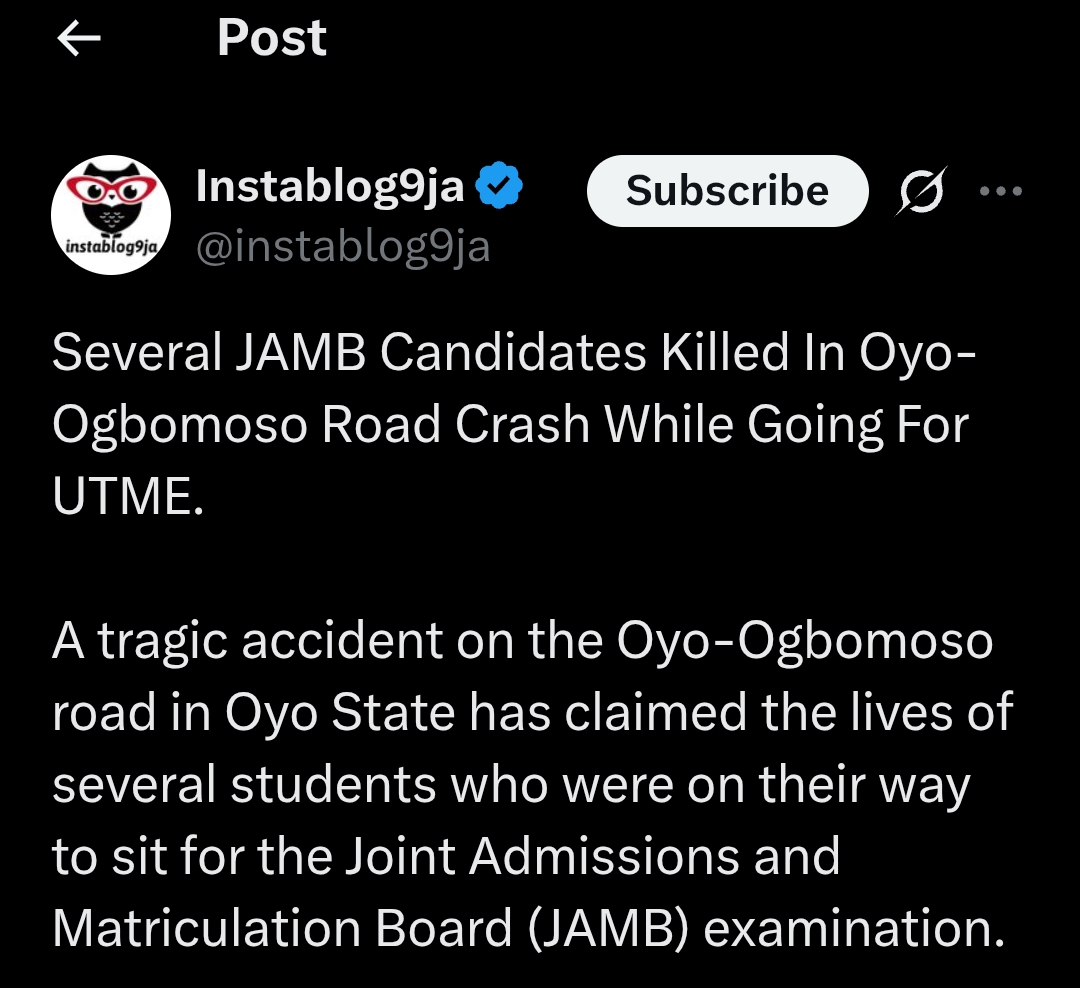 Several JAMB candidates have tragically passed away in a road accident after an alleged brake failure on the Oyo-Ogbomoso road in Oyo State.