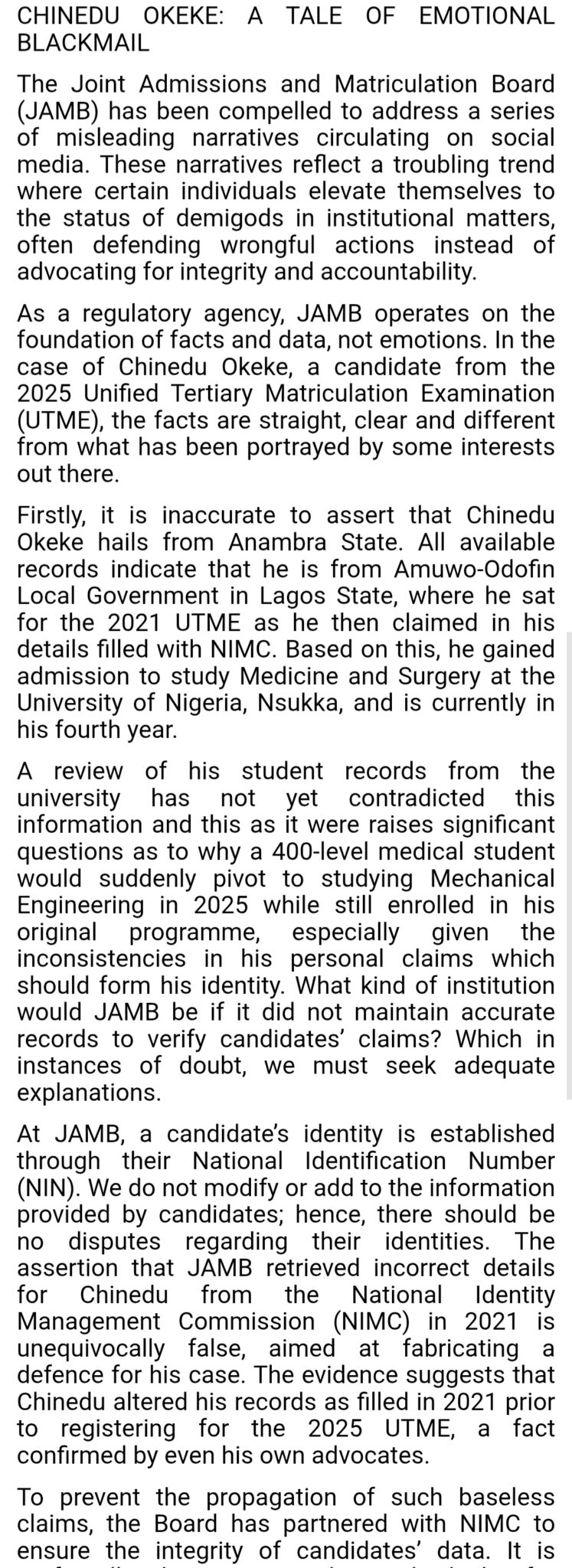 The Joint Admissions and Matriculation Board (JAMB) has denied claims that it is unfairly targeting Chinedu Okeke, the top scorer in the 2025 Unified Tertiary Matriculation Examination (UTME), who achieved 375 out of 400.
