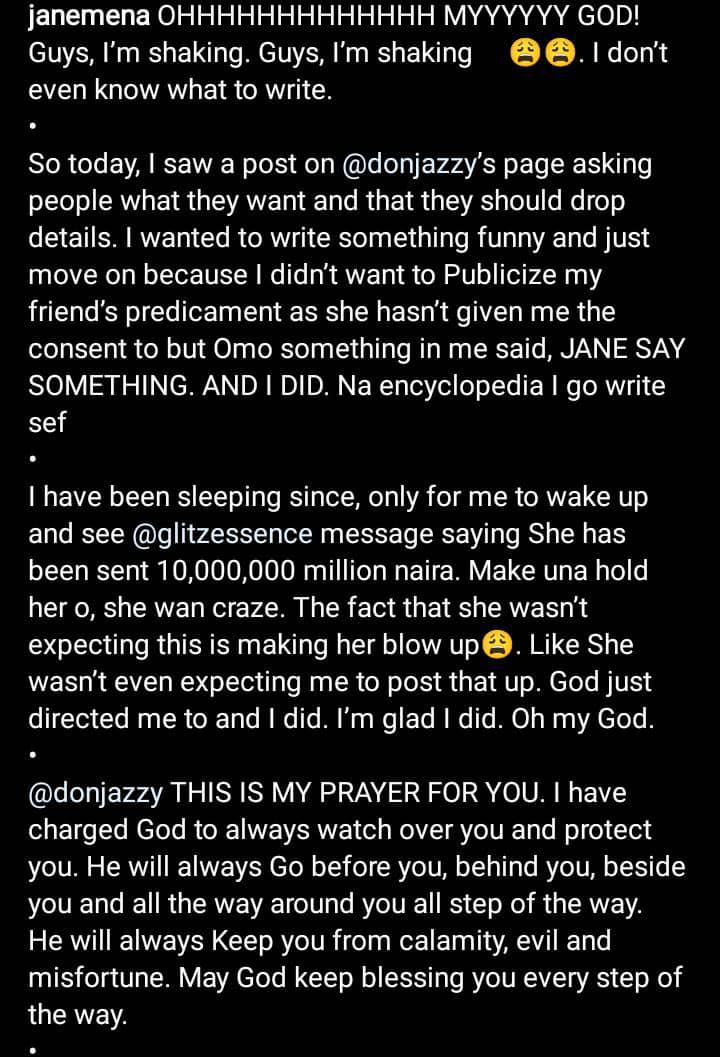 Nigerian dancer Jane Mena expressed her heartfelt gratitude and offered prayers for Don Jazzy after he generously gifted her friend N10 million.