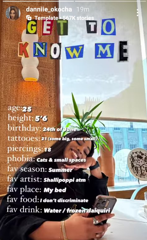 In the post, Daniella shared details such as her age, favorite place, height, tattoo, piercings, favorite season, and more.