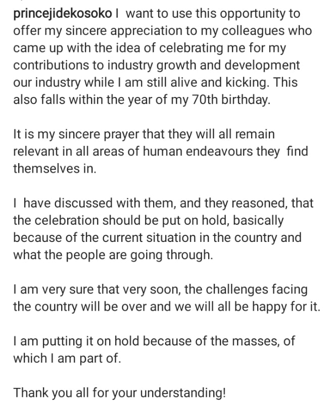 Due to the current state of affairs in Nigeria, veteran actor, Jide Kosoko has decided to postpone his planned celebration for his unwavering dedication to the movie industry.