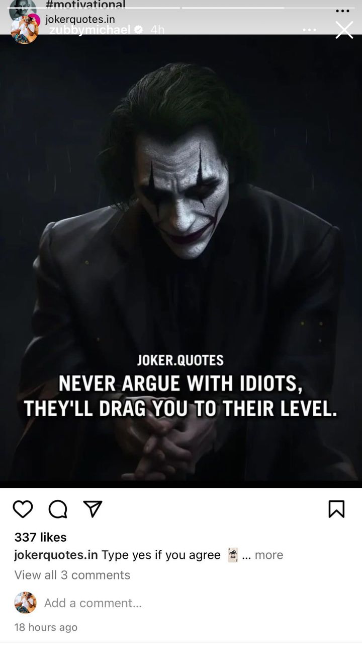 In response to the allegations, Zubby has taken to his Instagram story to share a subtle shade from a page that says, “Never argue with idiots, they’ll drag you to their level”.
