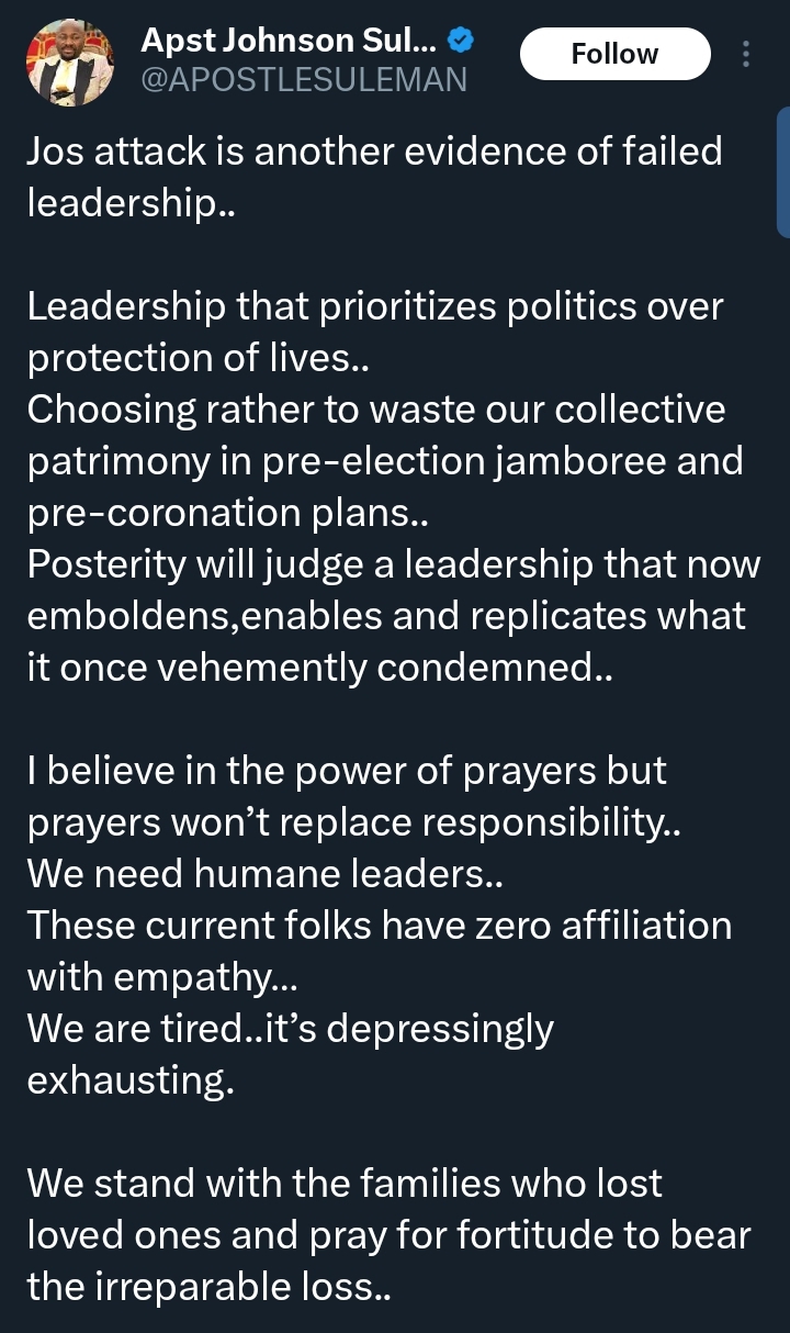 “Jos attack is another evidence of failed leadership,” he wrote. “Leadership that prioritizes politics over protection of lives.”
